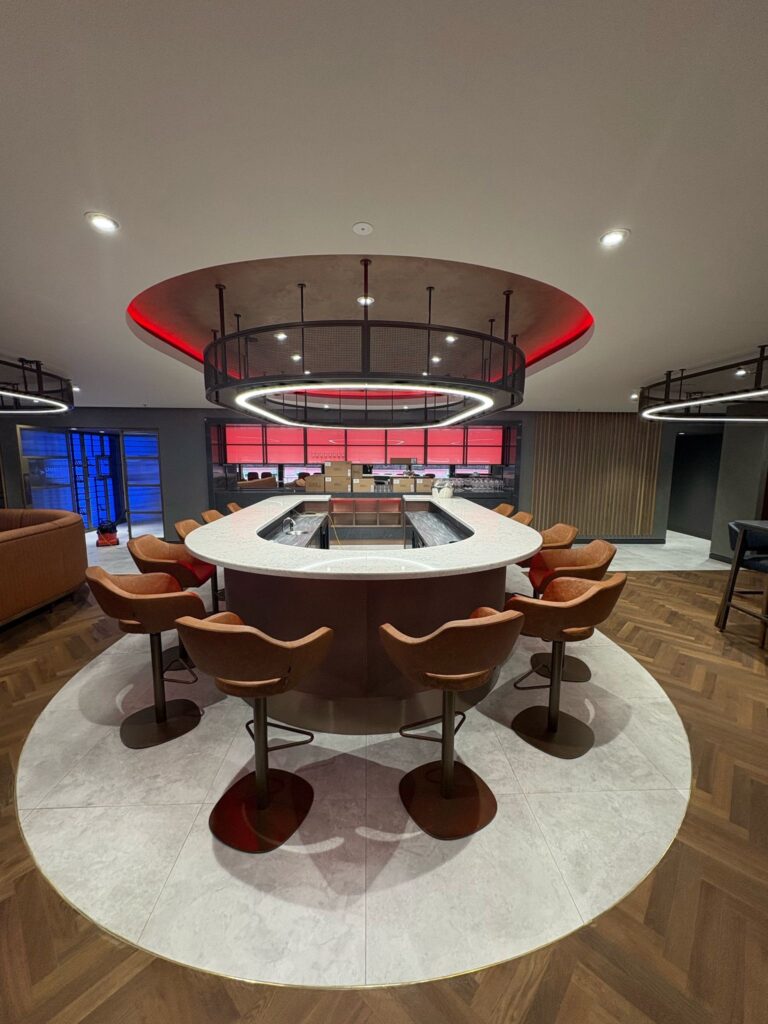 Overview: We were contracted by GG Renovations to perform our sealant services for a project at Wembley Stadium, where two box viewing rooms were combined into a spacious area featuring a stunning central bar. Our team applied high-quality silicone around all newly formed joints and edges, ensuring a seamless and waterproof finish. This meticulous attention to detail not only enhanced the aesthetic appeal of the space but also provided long-lasting durability, making it an inviting environment for visitors.